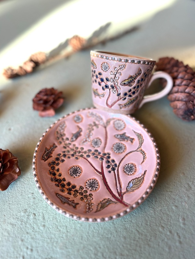 清流のヤマメが泳ぎ ヨウシュヤマゴボウの実がゆれる カップ&ソーサーです。 手描き手轆轤で制作しています。 カップの釉薬たまりに貫入が入っています。 お使い頂くうちに貫入は濃くなり アンティーク感がましてゆきます。 カップサイズ 口径8センチ 高さ6.5センチ 食洗機のご使用はお控え下さい ☆年末にあたり配送の期日指定はできません。 ご理解の程お買い求めください。