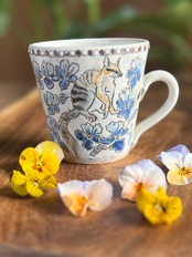 このマグカップは、可愛いフクロアリクイが中心に描かれ、周囲には色とりどりのビオラが美しくデザインされています。おしゃれな見た目は、飲み物を引き立てるだけでなく、インテリアとしても素敵な存在感を放ちます。