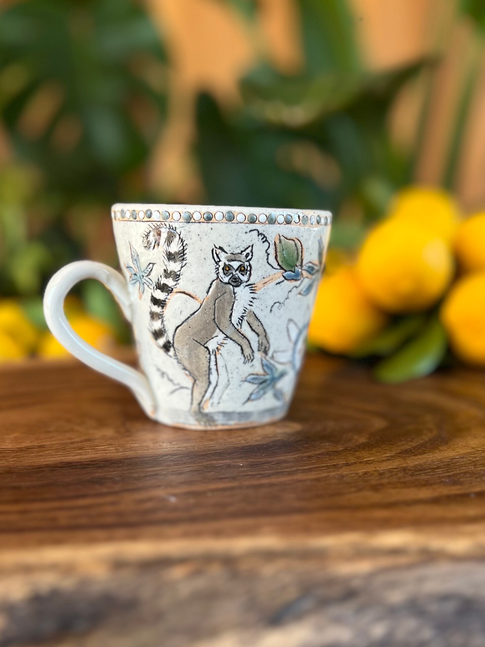 マダガスカルに生息する絶滅危惧種、ワオキツネザルが描かれたユニークなマグカップです。長くてシマシマのしっぽを立てた元気な姿が楽しい雰囲気を作り出し、毎日のコーヒーやティータイムを明るく彩ります。このマグカップは、見るたびに心をウキウキさせてくれるアイテムです。