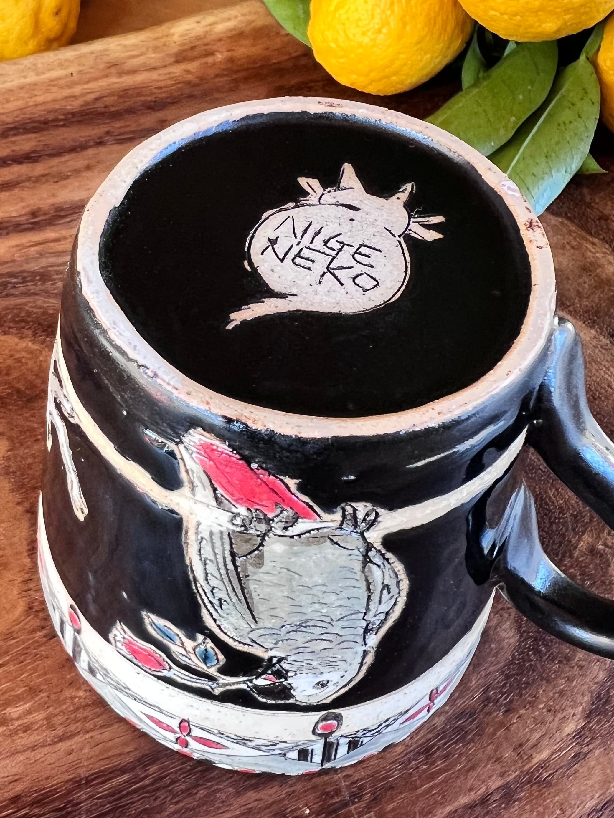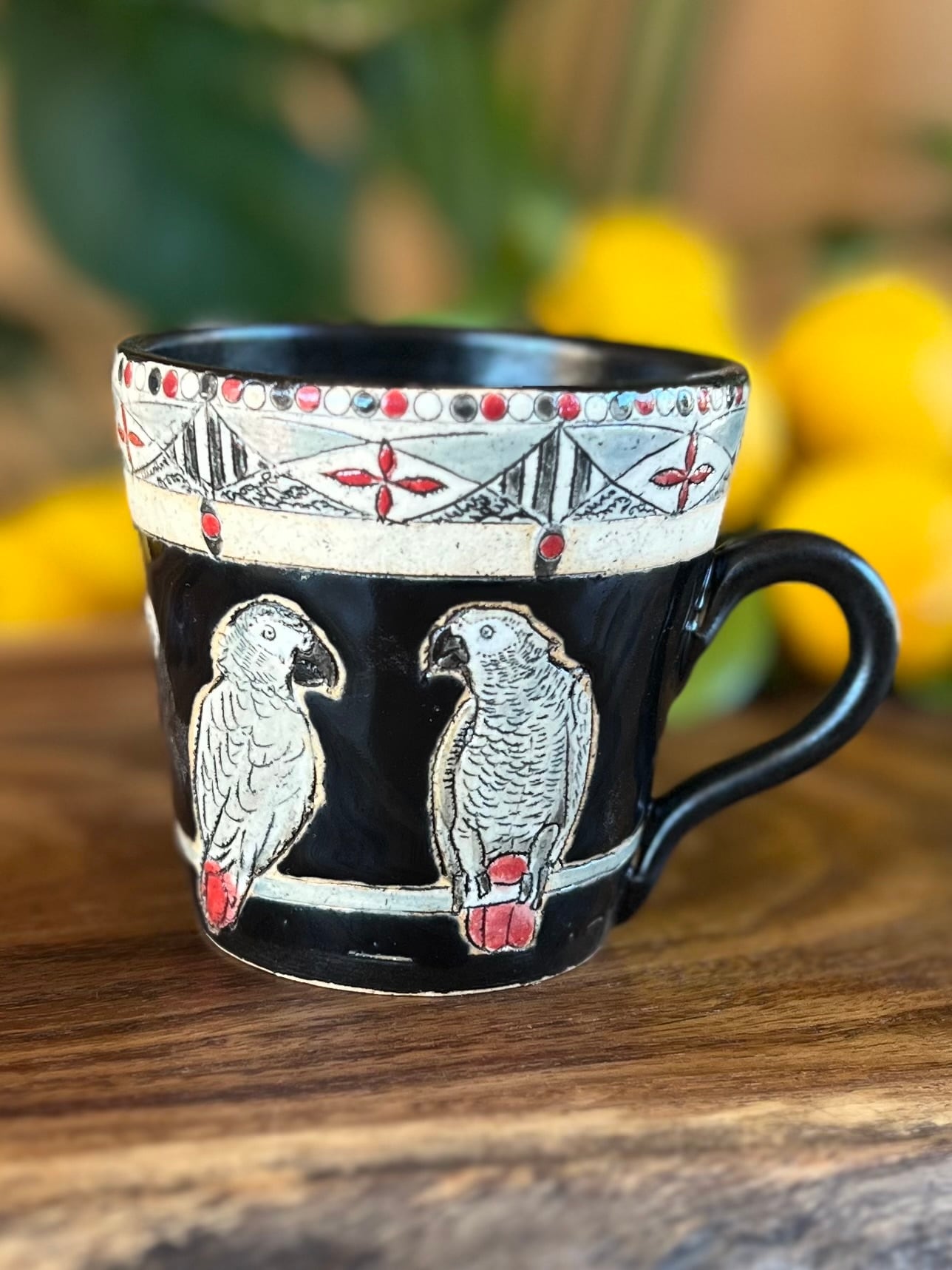 このマグカップには、何かを考えているかの様な表情のヨウムが中央に描かれており、それを光沢のある黒釉薬が引き立てています。