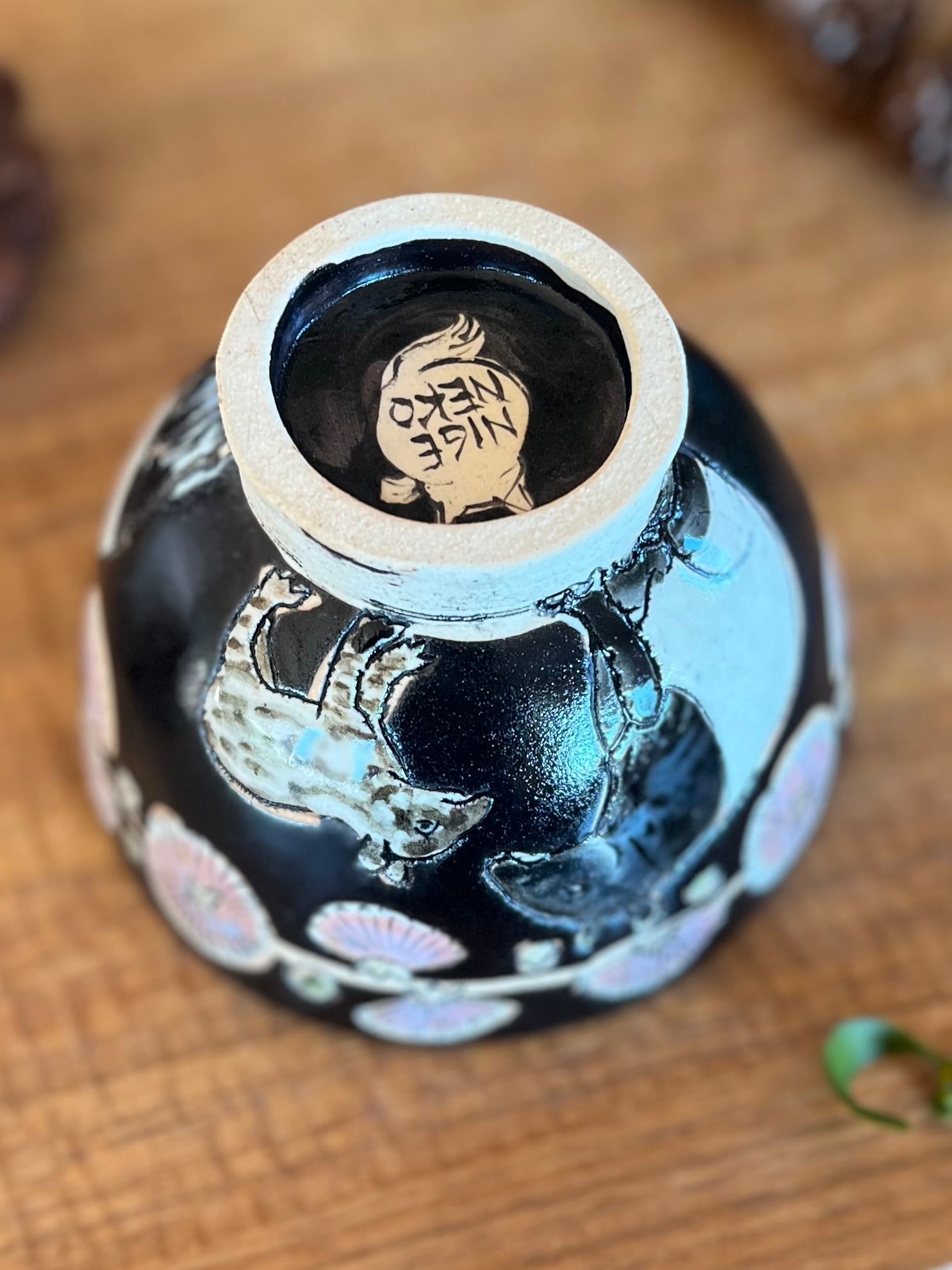 ポップな絵柄をマットな黒釉薬が引き立てます。